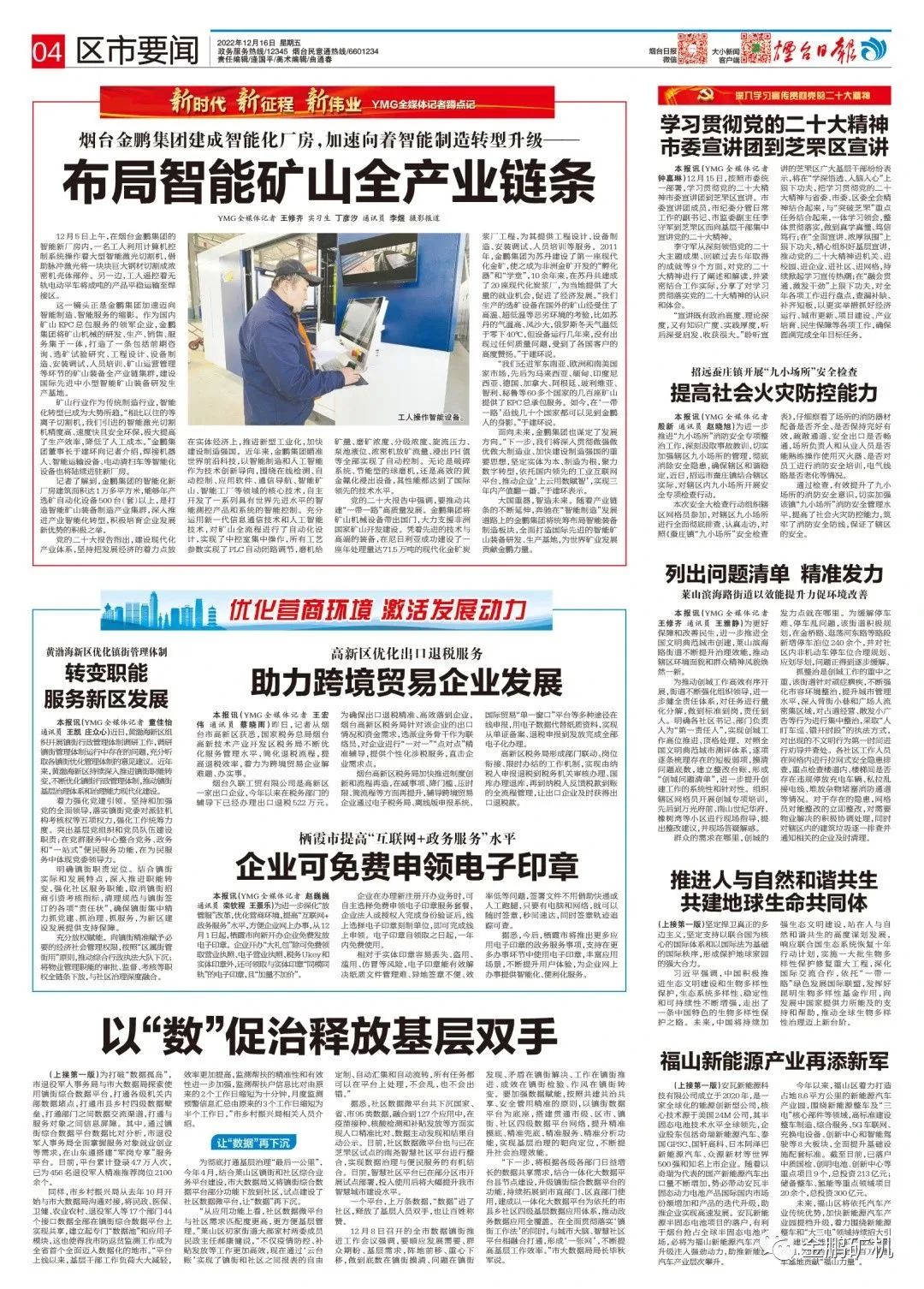 今天(12月16日),《煙臺日報》以《新時代 新征程 新偉業(yè)|煙臺金鵬集團布局智能礦山全產(chǎn)業(yè)鏈條》為題,大篇幅報道金鵬礦機緊緊抓住“一帶一路”發(fā)展機遇,圍繞“大國重器,智造未來”,統(tǒng)籌布局智能裝備制造板塊,實現(xiàn)高質量快速發(fā)展。