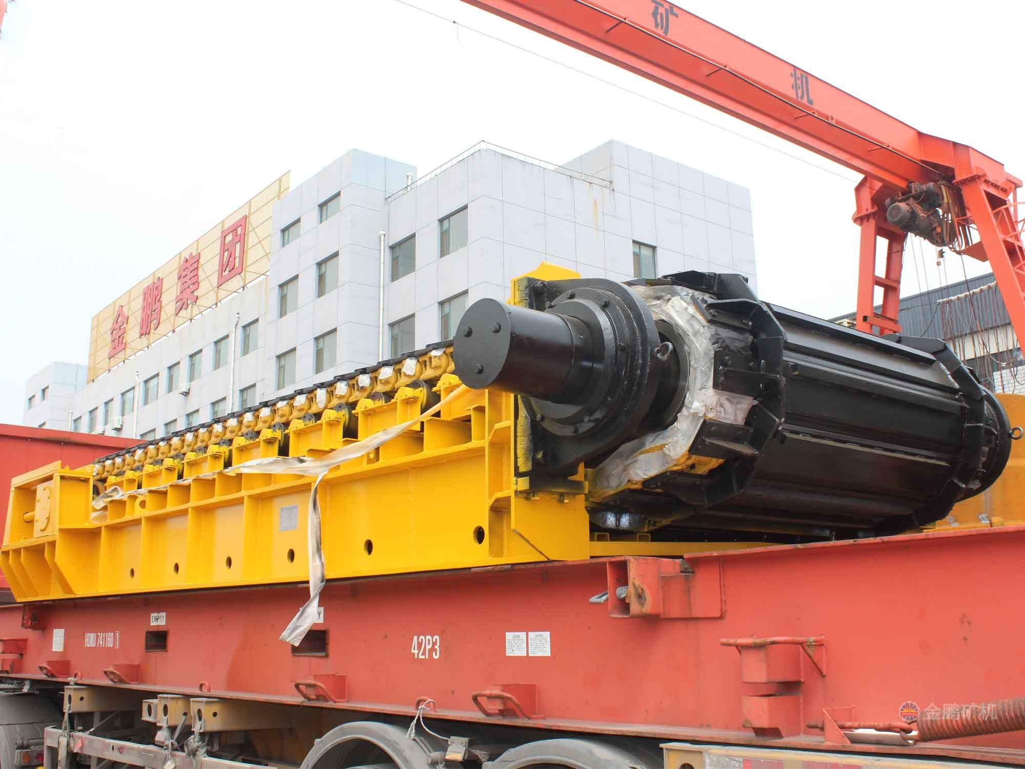 采用節(jié)距為200mm的高強(qiáng)度模鍛鏈條為牽引件,兩根鏈條繞過安裝在機(jī)體頭部的一對驅(qū)動鏈輪和機(jī)體尾部的一對張緊輪聯(lián)成封閉形回路,在兩排鏈條的每個鏈節(jié)上裝配了相互交迭的、重型結(jié)構(gòu)的輸送槽而成為一個連續(xù)的能夠運(yùn)載物料的輸送線路。其自重和物料的重量由安裝在機(jī)體上的多排支重輪、鏈托輪和滑道梁支承。傳動系統(tǒng)經(jīng)交流變頻調(diào)速電動機(jī)聯(lián)接減速機(jī),再由漲套與驅(qū)動裝置直聯(lián)驅(qū)動運(yùn)載機(jī)構(gòu)低速運(yùn)行。將尾部料倉卸入的物料沿輸送線路運(yùn)至機(jī)體的前方排出,實(shí)現(xiàn)向下方的工作機(jī)械連續(xù)均勻喂料的目的。