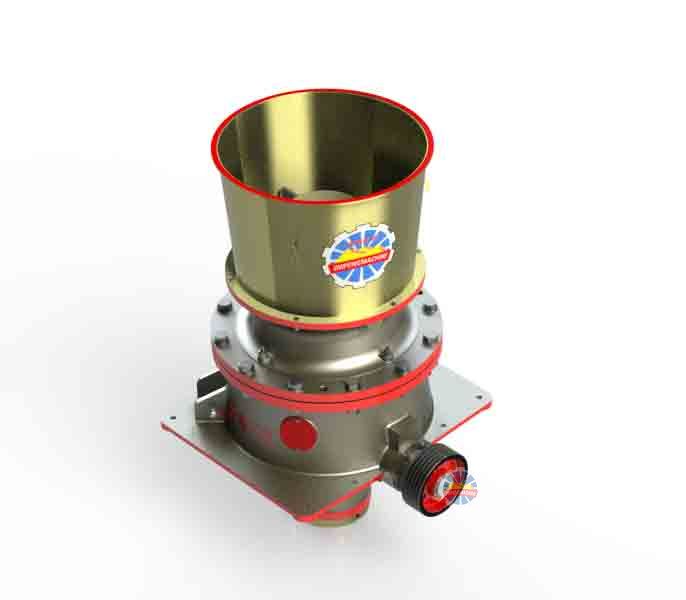 PYY圓錐破碎機工作時:電機帶動破碎機的小齒輪,小齒輪帶動大齒輪,大齒輪組件(大齒輪、大齒輪架、偏心鋼套)帶動偏心套組件(偏心缸套、偏心銅套)和主軸組件(主軸、內錐、內錐襯板)以理論垂直線為中心,在銅襯套內公轉,主軸組件在偏心銅套內以主軸的中心線可以實現自轉??諜C運行的時候,偏心套組件“抱著”主軸組件和隨大齒輪一同公轉,當物料加入到破碎腔后,主軸總成(主軸、內錐)在物料的阻力下在偏心銅套內緩慢的自轉。內錐的運行軌跡看起來是在破碎腔內來回擺動,同時緩慢的旋轉。物料被擺動的內錐擠壓破碎。支撐套與架體連接處靠液壓缸壓緊,當破碎機內落入金屬塊等不可破碎物體時,單缸的動錐由底部液壓活塞托起,起到排放口調整和過鐵保護、反復起落排除堵礦的作用。