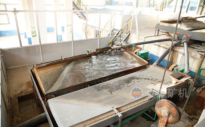 礦粒群從6s搖床床面上角的給礦槽送入,同時由給水槽供給橫向沖洗水,于是礦粒在重力,橫向流水沖力,床面作往復不對稱運動所產(chǎn)生的慣性和摩擦力的作用下,按比重和粒度分層,并沿床面作縱向運動和沿傾斜床面作橫向運動。比重和粒度不同的礦粒沿著各自的運動方向逐漸扇形流下,分別從搖床精礦端和尾礦側的不同區(qū)排出,最后被分成精礦,中礦和尾礦。