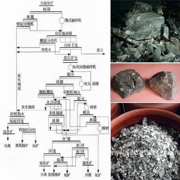 黑鎢礦多為石英大脈型或細(xì)脈型鎢礦床,嵌布粒度較粗,較易選別分離。對于黑鎢礦的選別,主要是以重選為主的聯(lián)合選礦工藝,分粗選、重選、精選和細(xì)泥處理4個(gè)階段。