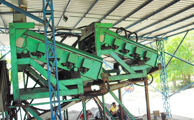 2、重選:黑鎢礦重選金鵬通常采用多級跳汰、多級搖床、中礦再磨的重選流程。細(xì)碎后合格礦經(jīng)過振動(dòng)篩分級后進(jìn)行多級跳汰,產(chǎn)出跳汰重選毛砂,粗粒級跳汰尾礦進(jìn)入磨機(jī)再磨,細(xì)粒級跳汰尾砂經(jīng)過分級機(jī)后進(jìn)入多級搖床選別,產(chǎn)出搖床重選毛砂,搖床尾礦排入尾礦庫,搖床中礦返回再磨再選,跳汰和搖床的重選毛砂進(jìn)入精選作業(yè)。